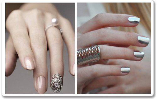 Klasszikus nude színek kis pimppel: a bal oldali verzión a csillám-ombre, a jobb oldalin a sematikus kis gyűrű teszi különlegessé a manikűrt.